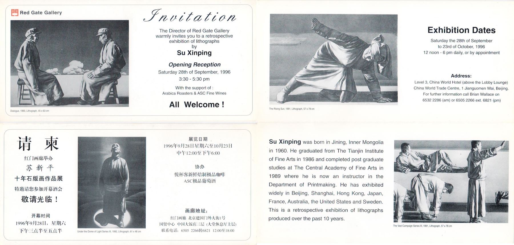 Su Xinping was born in Jinning, Inner Mongolia in 1960. He graduated from the Tianjing Institute of Fine Arts in 1986 and completed postgraduate studies at the Central Academy of Fine Arts in 1989 where he is now an instructor in the Department of Printmaking. He has exhibited widely in Beijing, Shanghai, Hong Kong, Japan, France, Australia, the United States and Sweden. This is a retrospective exhibition of lithographs produced over the past 10 years.